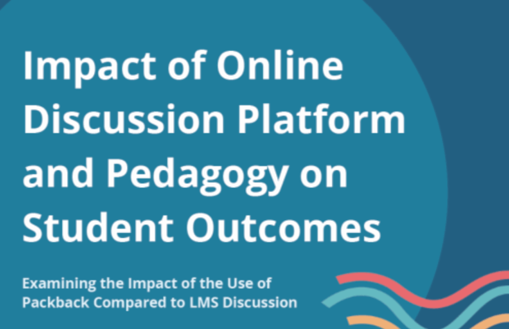 eBookPackback Discussions: Impact Report on Student Outcomes and Online DiscussionThis multi-institution IRB-approved study explores the impact of the use of Packback on grade outcomes, student engagement, and discussion quality. Packback Discussions Outcomes: 1.96× more student posts per assignment on Packback compared to LMS discussion boards 2× higher citation rate on Packback posts Students earned more A’s and B’s, and fewer D’s, F’s, and withdrawals compared to LMS discussions Over 80% of students and instructors preferred Packback to traditional discussion platforms Improved teaching evaluations in courses using Packback Discussions Get my eBook Discover how Packback Discussions nearly doubled student engagement and raised grades across multiple institutions Students using Packback were significantly more likely to receive A’s in the course. Students using Packback were significantly less likely to receive D’s or F’s in the course. 83% of students in treatment groups responded with positive sentiment to the statement, “Based on the discussion you experienced did you find Packback more effective than traditional online discussion boards?“ 84% of faculty participating in this study agreed or strongly agreed with the statement, “I find my students’ questions and conversations more dynamic and genuine this term (on Packback).“ Get Your eBook "*" indicates required fields First Name*Last Name*Email* Your Role*Select OneFaculty (Higher Education)Administrator (Higher Education)Instructor (K-12)Administrator (K-12)OtherInstitution*EmailThis field is for validation purposes and should be left unchanged.