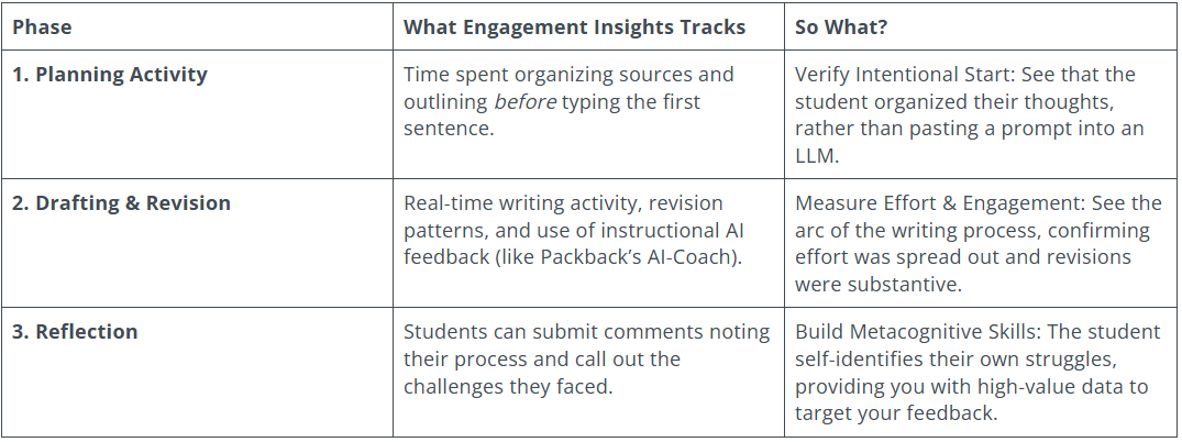 If the student is the hero, Generative AI has become the sidekick that is making them cognitively offload the adventure. And the instructor is left to police the final product, instead of guiding the process. Today, we are thrilled to announce Engagement Insights, a powerful new feature set within Packback Writing. It is our answer to this crisis of authenticity, trust, and invisible effort. Engagement Insights is not another detection tool; it is a writing process tool for formative assessment that helps you restore the integrity of the academic essay by making the invisible visible.